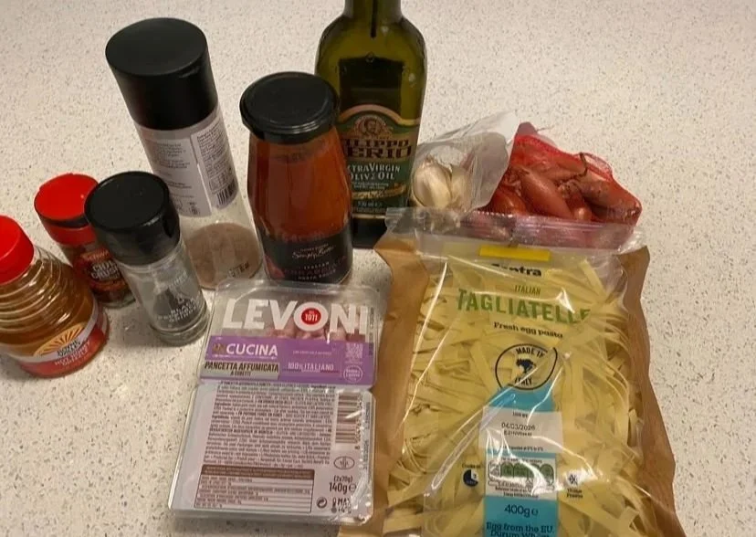 Egg Tagliatelle, Arribbiata Sauce (Dunne’s Stores), Fresh garlic & Shallots, Bacon lardons, Chilli flakes, salt, pepper & hot honey.