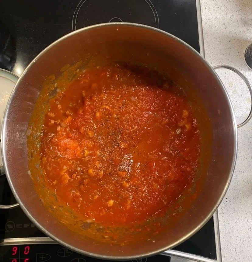 Fry off your lardons until golden, add your minced garlic & diced Shallots, let them cook for 3-4 minutes before adding the dried chilli & pasta sauce, then season. How delightfully simple.